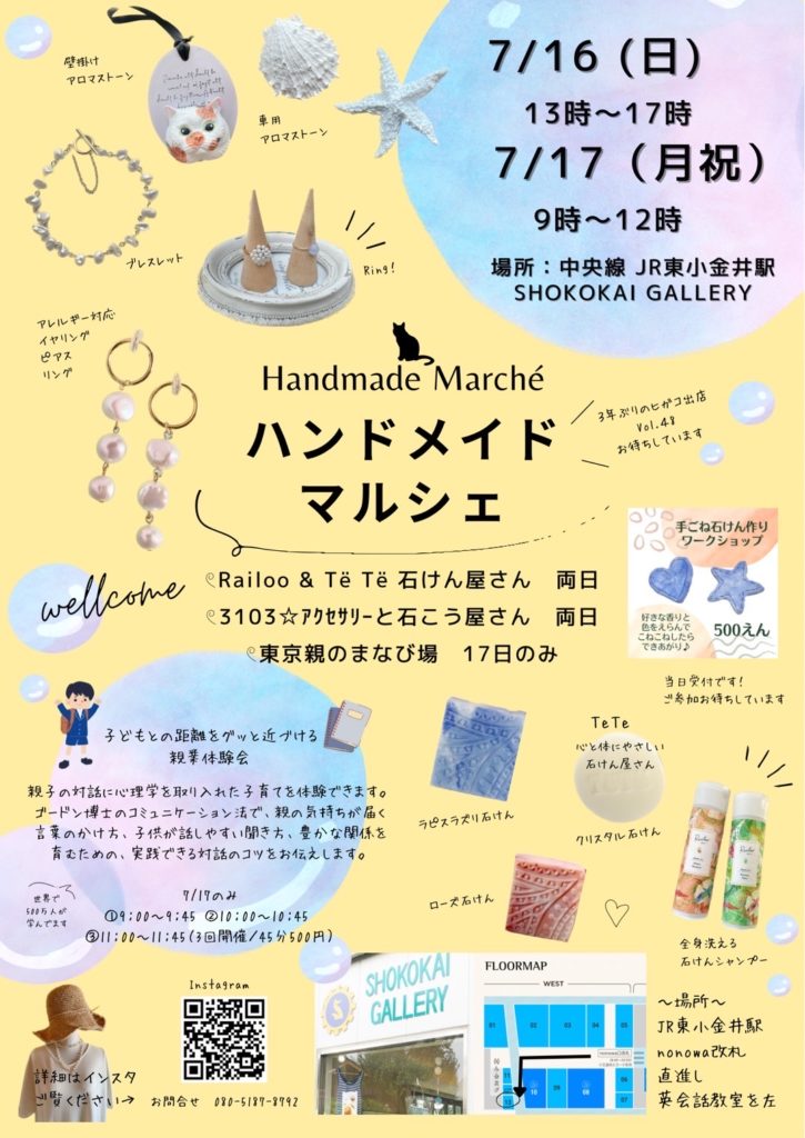 7月16日(日)17日(月祝) 中央線 JR東小金井駅内 商工会ギャラリーにて、3103ハンドメイドアクセサリー屋さんと、Railoo &TeTe石けん屋さんと、東京 親のまなび場がマルシェを開きます。