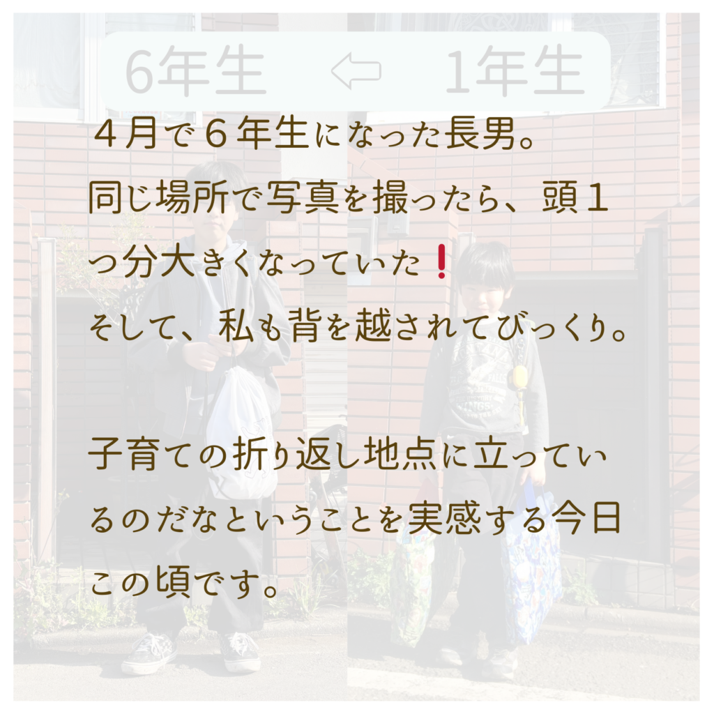 Categories 読みもの 6年間の成長 Post author By motoyama Post date 2024-04-25 同じ場所で写真を撮ったら、頭1つ分大きくなっていた❗️そして、私も背を越されてびっくり😳 子育ての折り返し地点に立っているのだなということを実感する今日この頃です。これからが本番とも言う?☺️ Tags 6年間の成長, 小学生 ← "親業訓練一般講座"第4回目 → ゴードンメソッド講演会登壇